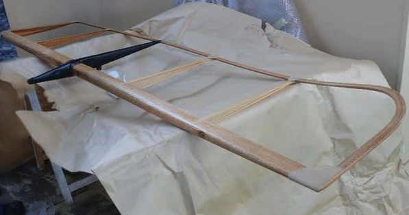 This is the wood and fabric tip from the right aileron and it measurtes 17-1/2 in. x 10-1/2 in. or 44 cm x 27 cm. For the purposes of this photo, the original wood tip has been slid out of the fabric pocket which is comprised of the upper and lower printed fabric and moved to the right and a wood stiffener has been inserted. The wood tip curves upwards. The third photo below shows the complete, original aileron from the LVG C.VI at the Royal Army Museum in Brussels and is courtesy of Bamf.