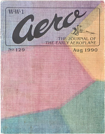 This piece of 5-color, undersurface, camouflage, lozenge printed fabric measures 26-1/2 in. x 19 in. or 67 cm x 48 cm and has a thread count of 56 threads per inch. It has a small amount of varnish or dope along the bottom edge. It may have been used as the fabric wall behind the pilot's seat of a German aircraft. From the Michael Baldwin Collection. It is shown here by itself and with a copy of issue no. 129 of World War One Aero, the cover of which had an exact photo of the same type of fabric printed at full-scale. The magazine does not accompany the lot.