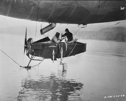 This is a collapsible water ballast bucket from an “early airship,” such as a B-class, C- or possibly J-class. It’s made of aluminum-doped, rubberized fabric and measures 10” high by 10.5” wide. The close-up of the top shows a small, round collapsible fabric opening which has a fine metal-mesh strainer. The bucket is meant to be dunked into a lake or ocean so that water fills it through the half-open top and can then be used as ballast aboard an airship as well as quickly poured out when no longer needed. It also may have been used to hoist aboard fuel oil, atleast for C-class airships. A photo below of C-3 annotated on the front “Dirigible taking on oil” has written on the reverse “Arrow shows container holding 10 gal of motor oil being hoisted on board for use of motors. Line attached to same may readily be distinguished...,” an example of early in-flight refueling. The 5 airship photos shown are, in this order, (1) a C-3 in 1920 hauling up motor oil (2) two men fishing from a ‘Pony’ blimp in 1920 with water ballast buckets beneath them, (3) the car of a B-class airship, (4) an army TC-1 airship in 1923, and (5) J-3 and J-4 taking off from N.A.S. Lakehurst in 1928. The U.S. Navy airship J-3 took off from N.A.S. Lakehurst on January 5, 1928, with 5 aboard including T.G.W. ‘Tex’ Settle in command. Both engines stopped because the fuel lines from the overhead fuel storage tank to the gravity-fed tank was "clogged with ice," the author explains. To get fuel directly to one of the gravity-fed tanks, Settle decided to drain fuel from the storage tank and put it right into the gravity-fed tank, bypassing the clogged fuel line. The book goes on to say "The J-3 carried a canvas bucket for use in picking up seawater for ballast. Opening a drain cock at the bottom of one of the storage tanks - with great difficulty, it turned out - fuel was drained, bucket by bucket, and hand- poured into the gravity tank." (p. 48, J. Gordon Vaeth, They sailed the skies: U.S. Navy balloons and the Airship Program). J-3 in the background and J-4 up front are seen taking-off from N.A.S. Lakehurst in 1928. The entire group includes the bucket plus its round case with a snap closure, also made of aluminum-doped ruberized fabric, the two original notes and a copy of the book cited above. Note that the bucket is no longer collapsible. From the Joan Reisig Collection. Joan Reisig's obituary states that she “worked for engineering firms in Cleveland and the Akron area before working for Goodyear Aerospace as a design draftsman in advanced airships. Also, at the Wingfoot Lake Blimp Base for a total of 20 years. She was associated with the Lighter than Air Society” (Akron Beacon Journal, March 25, 2019). Later in her career she was the archivist for the Engineering Department of the Airship Support Group at Goodyear.